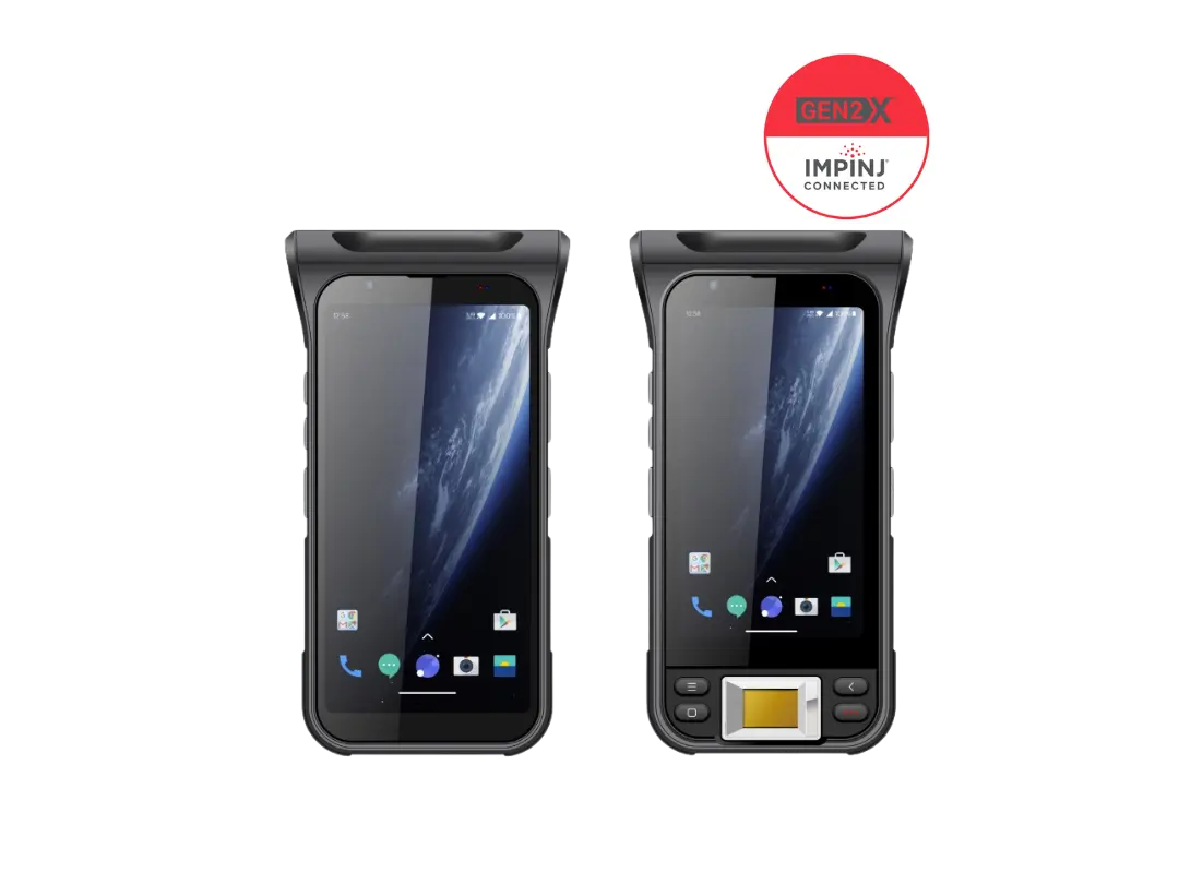 A premium all-in-one UHF RFID handheld, combining high read performance, rugged design and advanced sensor capabilities. The UHF module is based on the Impinj E710 chip, supporting Gen2X, with read rates of 1 300+ tags/sec and read range of up to 30 m+. It runs Android 11/13, a removable battery (6 700/13 400 mAh pistol grip style), and optional sensor set including gravity, proximity, geomagnetic and gyroscope. It has IP65 sealing, 1.5 m drop proofing, a 5- or 6-inch display, optional fingerprint reading, and front- and rear facing cameras.
